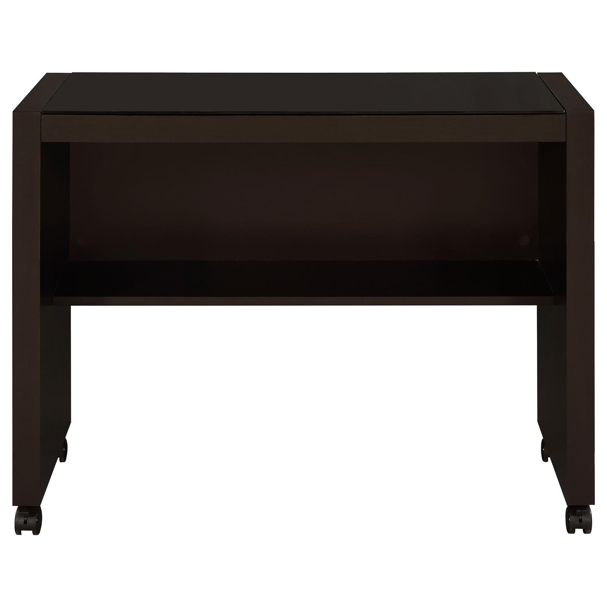Romance CopyComplete any office space with this effortlessly functional mobile return. A spacious storage shelf offers a convenient stash spot for books and office essentials while smooth caster wheels allow it to easily move from place to place.Product DetailsSet includesOne (1) mobile returnWriting desk dimensions26.75 inches high x 34.75 inches wide x 15.75 inches deepFinish colorCappuccino and BlackMaterialsHollow board, melamine paper, glass and particle boardNumber of shelves1