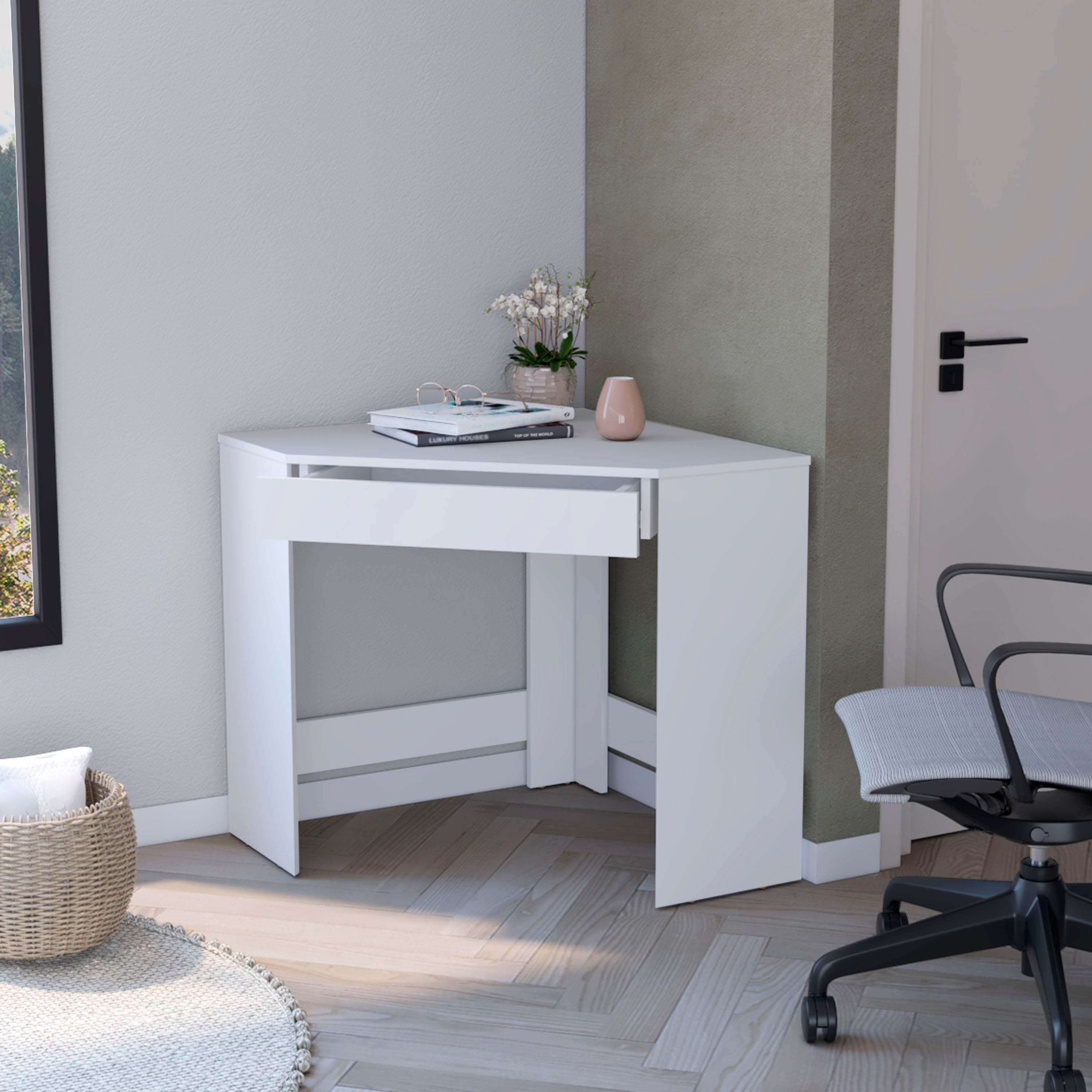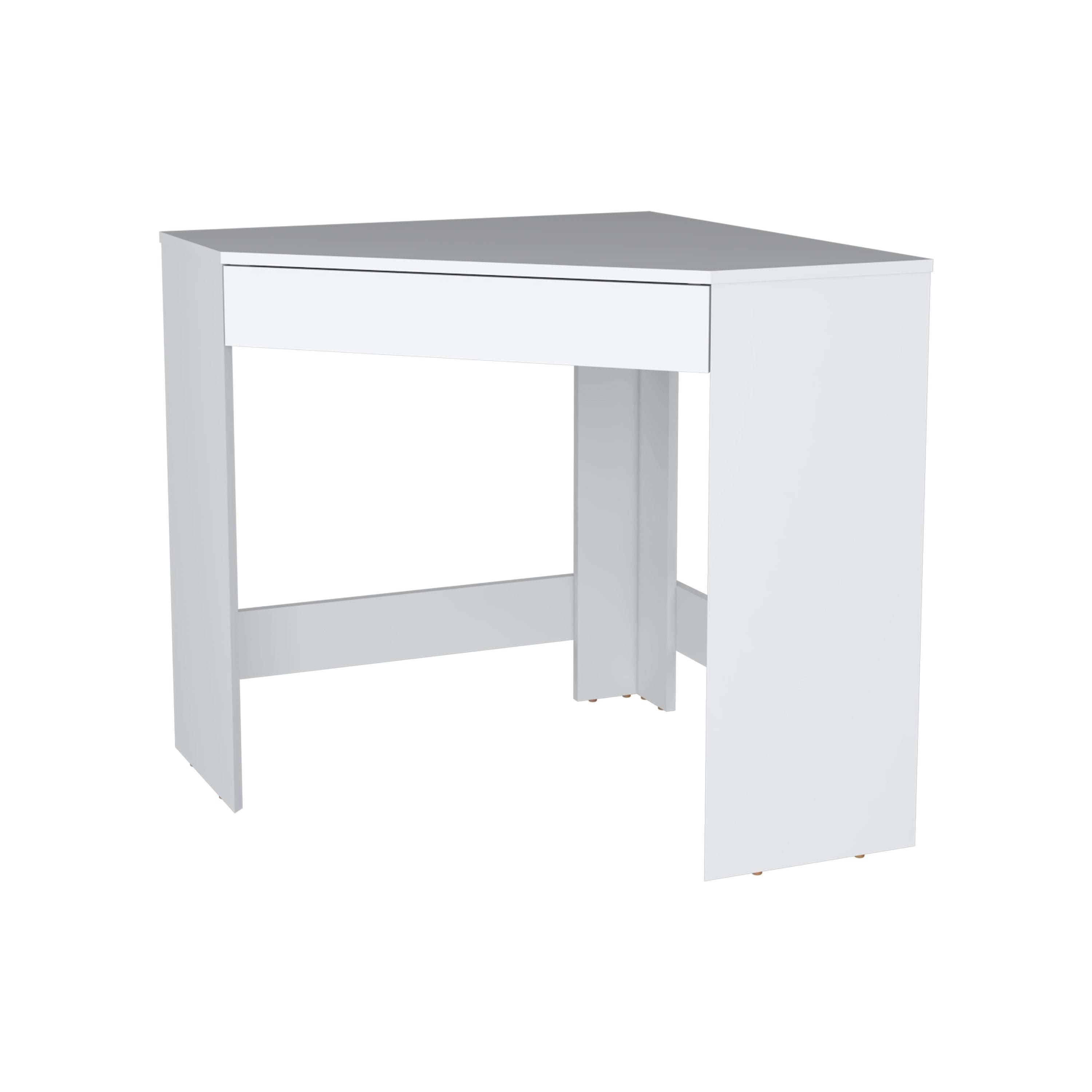 Romance CopyTransform any corner into a productive hub with the corner desk. Boasting ample workspace and a convenient drawer, it's the perfect blend of practicality and contemporary design in a sleek white finish, ideal for compact settings.Product DetailsSet includesOne (1) corner deskDimensions29.1 inches high x 29.9 inches wide x 29.9 inches deepFinish colorWhiteNumber of drawers1