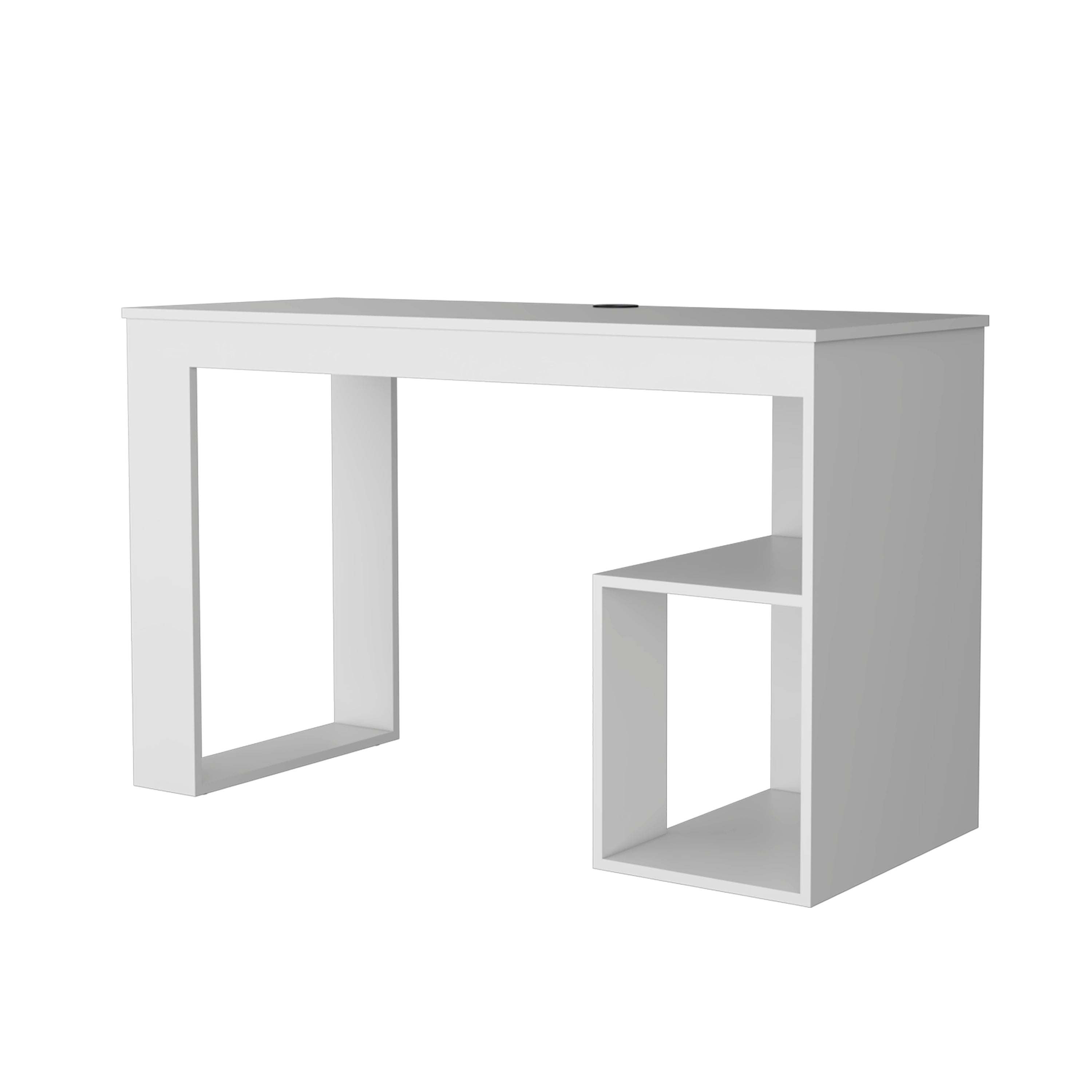 Romance CopyDiscover the desk, boasting ample space and an open layout with multiple shelves for quick storage or decor, providing a contemporary and modern design for a clean working space suitable for laptops or desktop computers, ensuring a comfortable working area. Its unique design adds a touch of originality while being simple, easy to accommodate, practical, and lightweight, making it an excellent choice for small spaces in need of a beautiful and functional desk.Product DetailsSet includesOne (1) writing deskDimensions29 inches high x 47.24 inches wide x 19.69 inches deepFinish colorWhiteNumber of shelves2