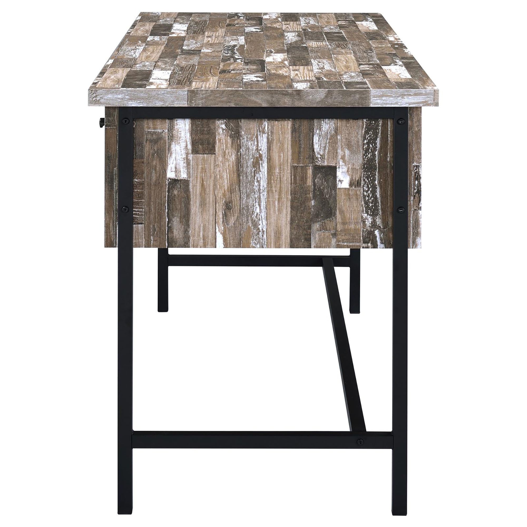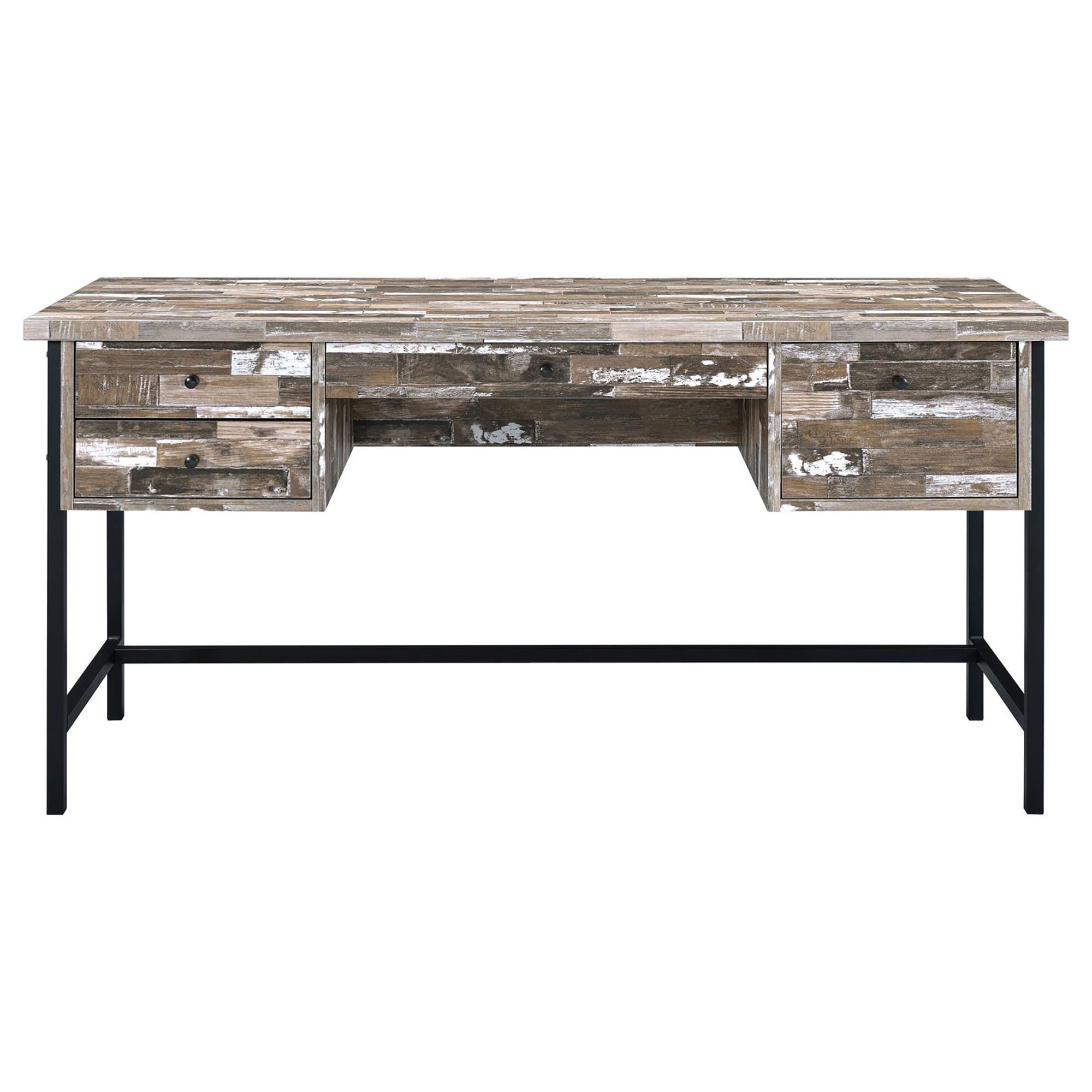 Romance CopyUnique and urban, this writing desk will add a bit of modern style to your home. The sleek metal frame features a plank wood top with a salvaged cabin wood finish that gives the piece an industrial look. The writing desk features four utility to drawers to keep your area clean and organize.Product DetailsSet includesOne (1) writing deskDimensions30.5 inches high x 60 inches wide x 23.5 inches deepFinish ColorSalvaged Cabin and BlackMaterialsEngineered veneer, hollow board, particle board, MDF and metalHandle finishBronzeNumber of drawers4Hardware typeMetal knob