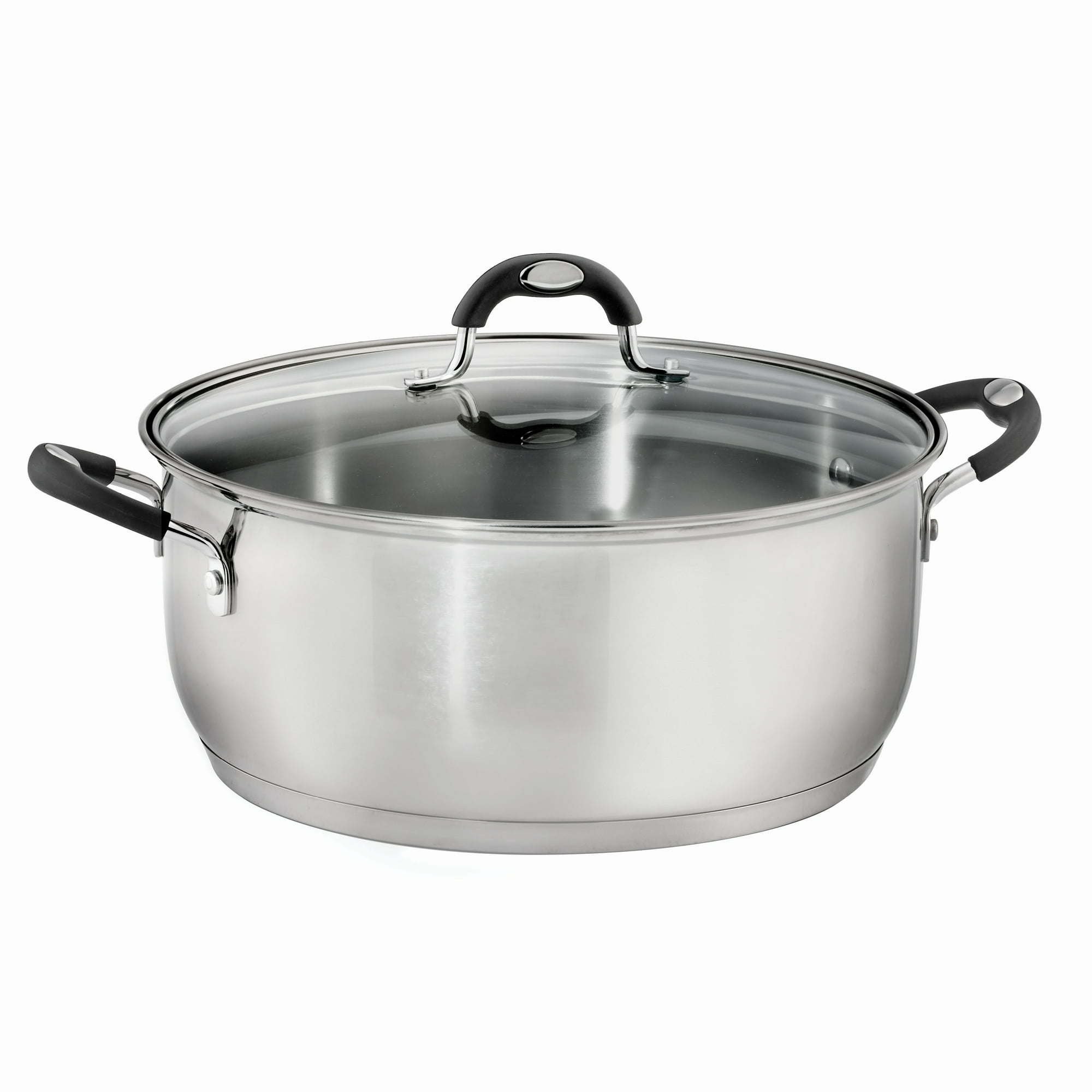 Tramontina's Gourmet Stainless Steel 9 Qt. Covered Dutch Oven is a must have for making large batches of soups, stews and chili, boiling seafood, or slow-cooking large cuts of meat. The induction-ready tri-ply base distributes heat quickly and evenly, while the heat- and shatter-resistant glass lid allows you to monitor your cooking progress. Ergonomically designed, riveted, soft-grip silicone handles ensure a comfortable grip and provide added support when handling a filled pot.