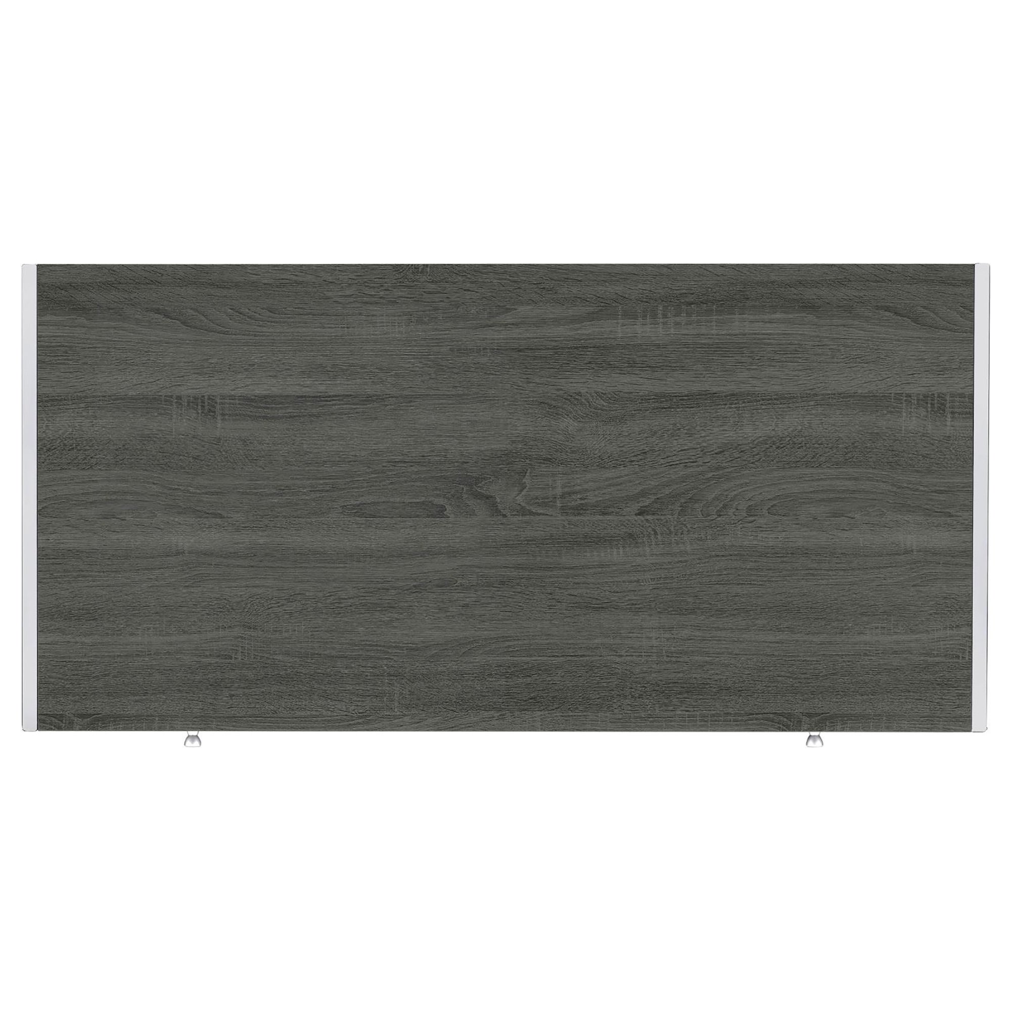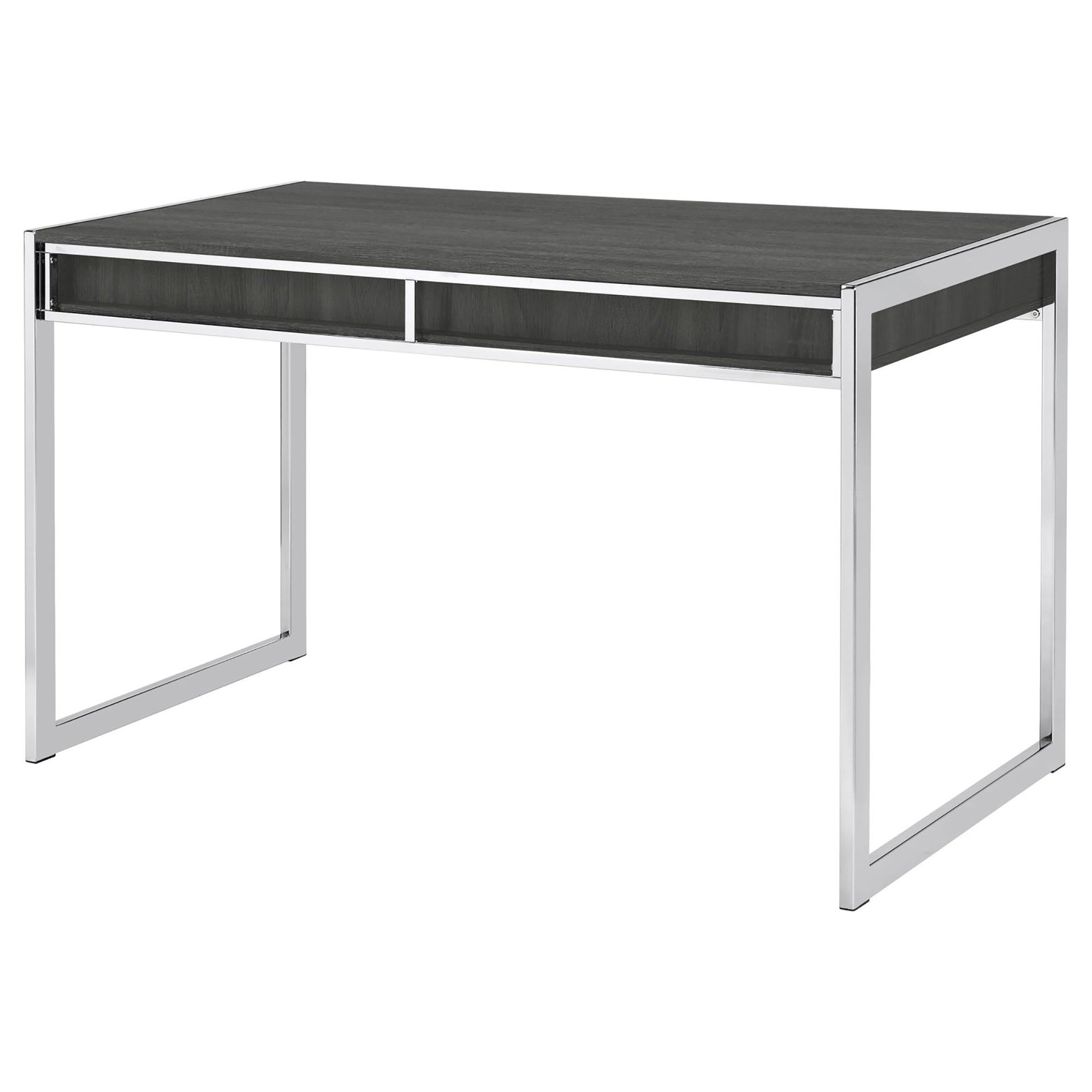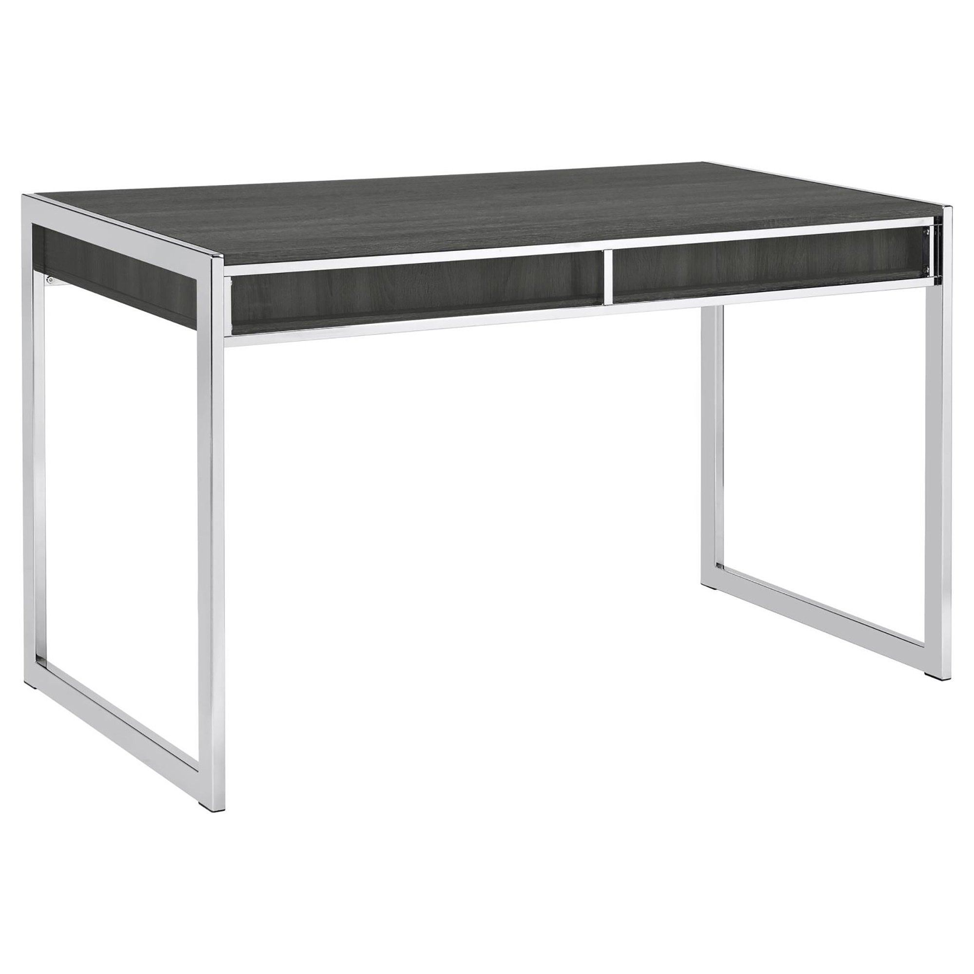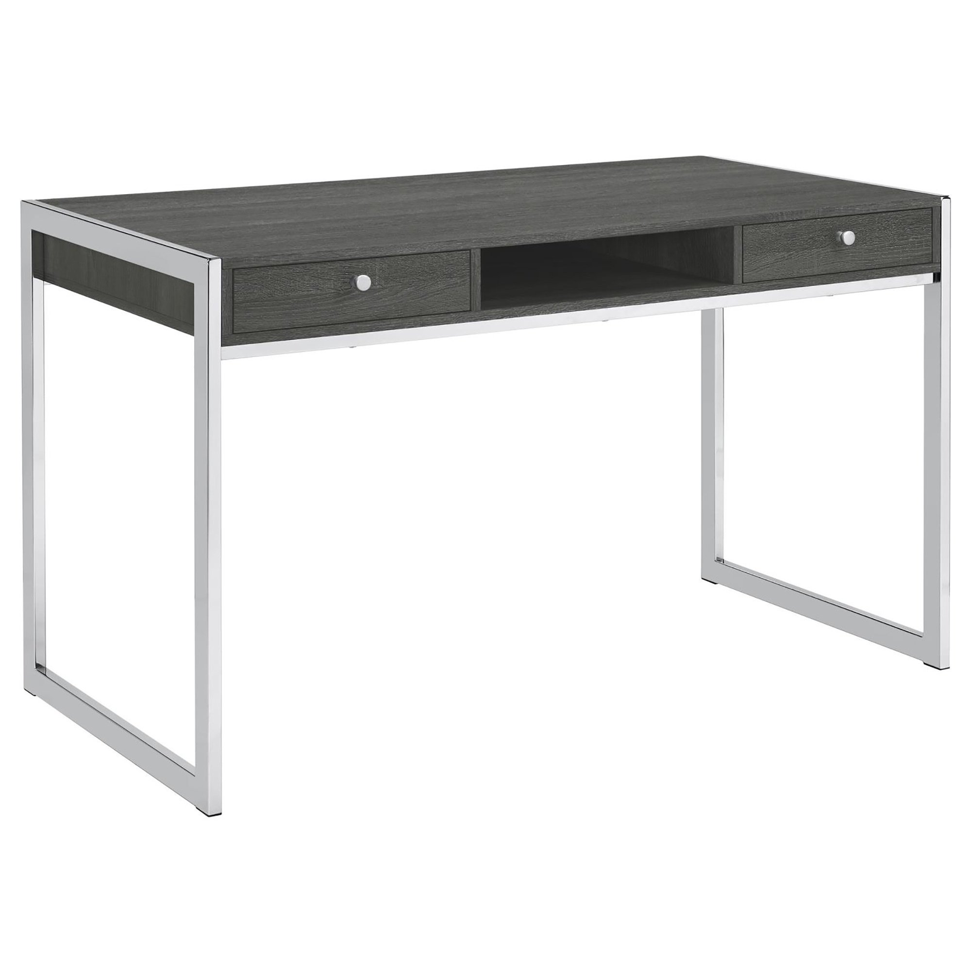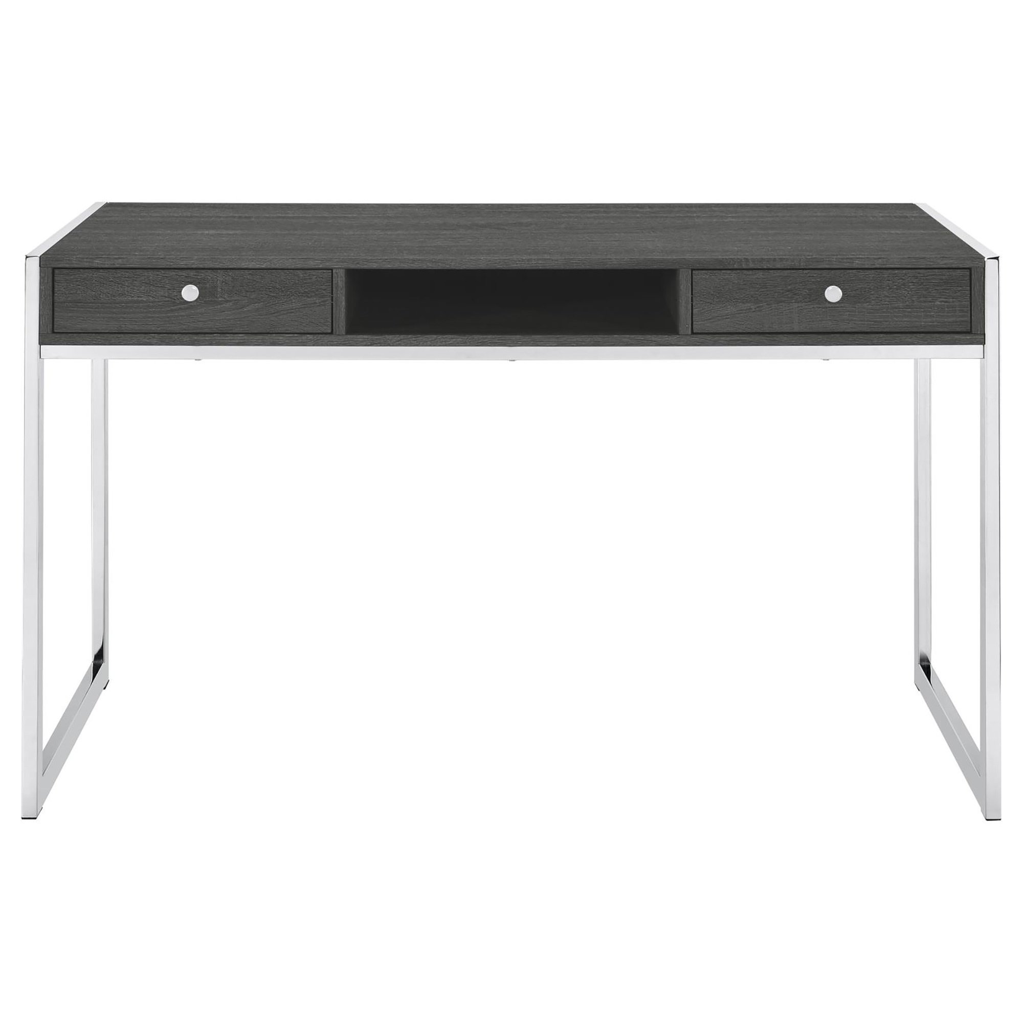Romance CopySeamless design elements with minimalist styling form a tasteful profile in this contemporary writing desk. Wood construction join a sleek chrome finish metal base to present a sophisticated contrast, as an open center compartment and two easy-glide drawers set up space for storage.Product DetailsSet includesOne (1) writing deskDimensions29.5 inches high x 48.75 inches wide x 23.5 inches deepFinish ColorWeathered GreyMaterialsMetal, MDF, particle board and paper veneerDrawer structurePin constructionDrawer glide typeFull extension-2 stepsHandle finishSilverNumber of drawers2Number of shelves1